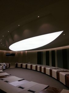 Ainsi, la partie translucide rétro-éclairée s’harmonise totalement avec les courbes de la salle de conférence et favorise une répartition égale de la lumière.