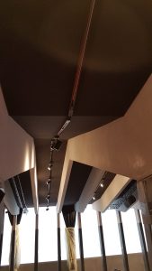 Pour améliorer encore un peu plus l’isolation, nous avons posé plus de 100 tringles et rideaux dans cette salle. Chacun de ces rideaux faisant 20 m de long sur 4.50 m de hauteur, le volume de tissus était conséquent. Chacun de ces rideaux a été conçu en tissu de la marque Kvadrat, premier fabricant de tissus en Europe, qui propose des créations contemporaines de qualité dont les textiles sont reconnus pour leurs innovations techniques.